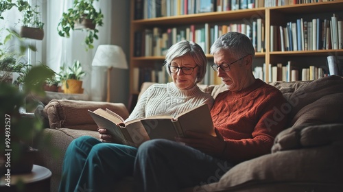 An adult couple sitting in a cozy living room, reading books together, with a sense of tranquility and mutual support, reflecting the lifelong pursuit of knowledge and the joy of shared intellectual