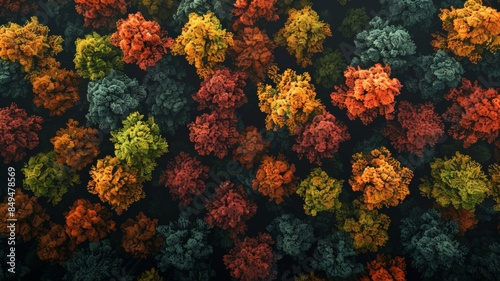 An aerial perspective reveals a patchwork of autumn trees, each one a unique shade of red, orange, green, or yellow. The dense canopy creates a stunning mosaic from above.