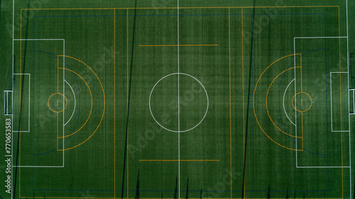 An aerial view looking down at a green soccer field at sunrise