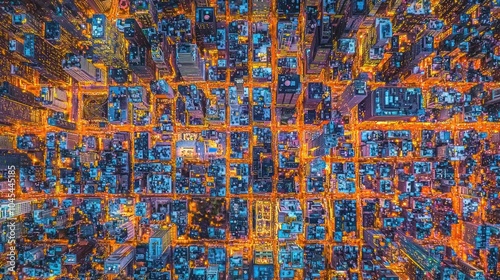 An aerial view of a city at night, with illuminated buildings and streets.
