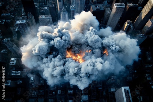 An aerial view of a massive explosion with thick smoke engulfing the city, presenting a dramatic and powerful scene of urban destruction.