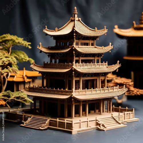 an AI Image Generator, Intricate Wooden Model of a Traditional Asian Pagoda