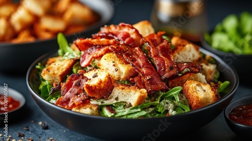 An alluring display of crisp bacon coupled with freshly prepared croutons, enhancing the vibrant and fresh greens to create a delicious hearty meal.