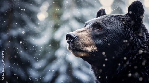 An American black bear against white winter snowfall ambience background with space for text, background image, AI generated