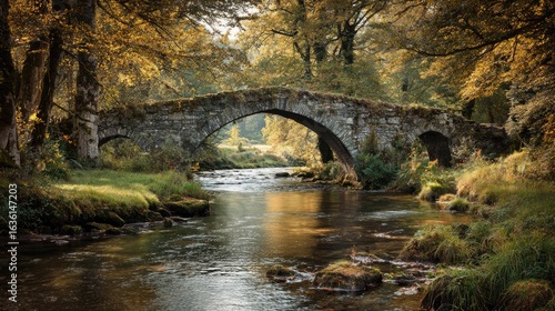 An ancient stone bridge over a river in the countryside, autumn, high resolution