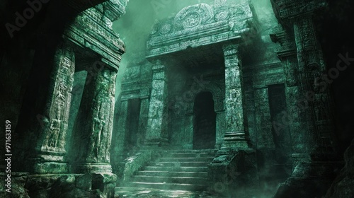 An Ancient Stone Temple Entrance in a Foggy Jungle