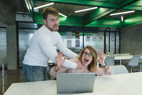An angry boss strangles a girl who works in the office behind a laptop. Violence in the office.