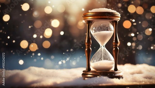 an antique hourglass sits gracefully as snow falls around it accompanied by blurred bokeh lights creating a peaceful winter ambiance