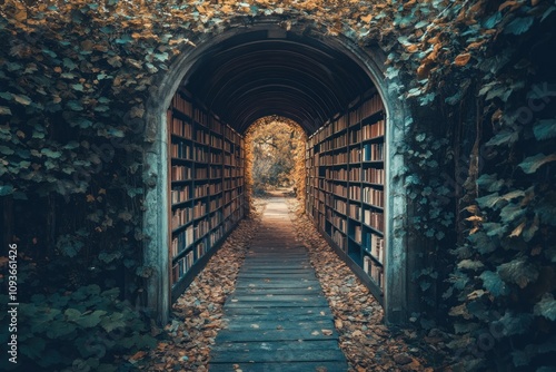 An arched doorway covered in ivy leads to a path lined with bookshelves.