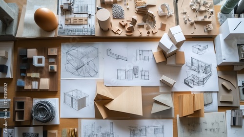 An architect's workspace filled with abstract sketches and models, representing cutting-edge design thinking.