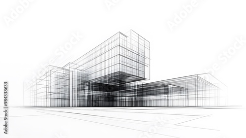 An architectural wireframe sketch of a modern office complex, showcasing transparent structures, geometric lines, and a monochrome grayscale design with a minimalist aesthetic.