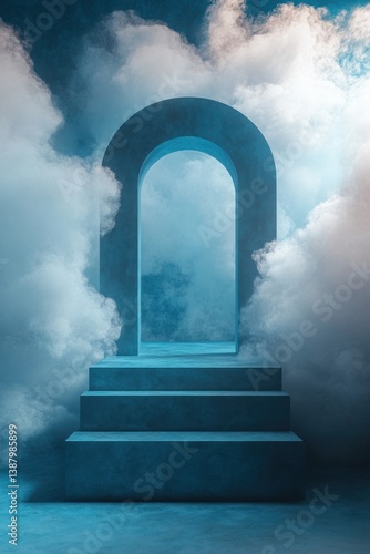 An archway and stairway are surrounded by fluffy clouds