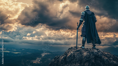 An armored knight standing at the top of a mountain, his sword raised towards the sky as a storm approaches from the horizon.