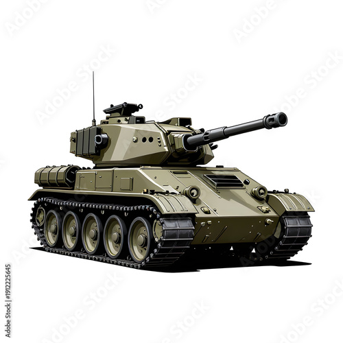 An army battle tank with a cannon on tracks. Military paint. Comic illustration.