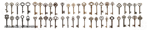 An Array of Vintage Keys with Intricate Designs and Varied Styles, Isolated on Transparent, white background