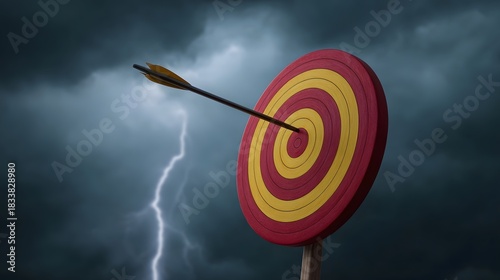 An arrow strikes the bullseye of a target against a dramatic stormy sky with lightning