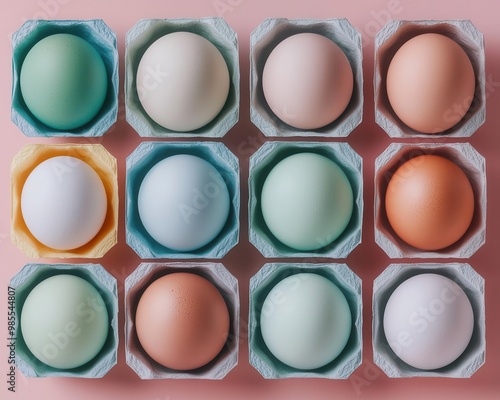 An artistic arrangement of egg cartons in various colors, all labeled as recyclable, representing the blend of creativity and sustainability in packaging design