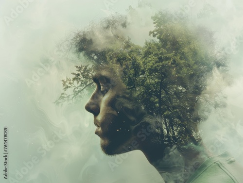An artistic portrayal of a male profile with a double exposure effect, merging with the branches of a tree, symbolizing growth and strength.