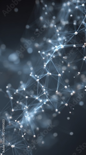 An artistic representation of an abstract network of interconnected nodes depicting science and technology, focusing on data networks, digital innovation, research collaboration, and the dynamic