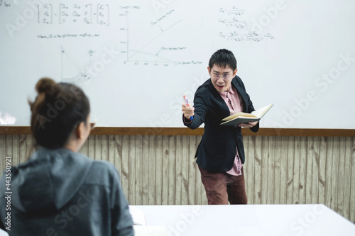 An Asian male teacher in a classroom near the whiteboard is writing and teaching a lesson with a special lecture in a class column. Math teacher explains arithmetic sums to university students