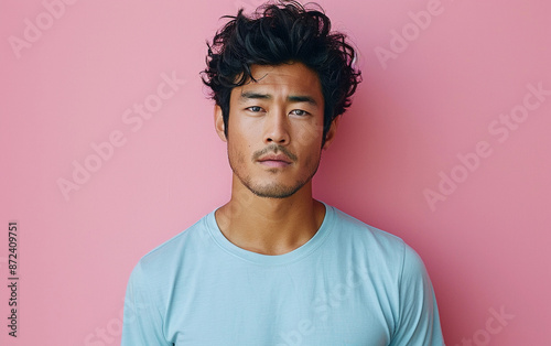 An Asian man with curly black hair and a blue t-shirt poses against a pink background