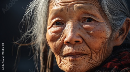 An asian old woman looking at the viewer