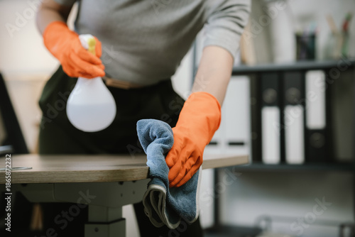 An Asian woman wearing orange rubber gloves wipes a wooden desk with a microfiber cloth and spray bottle in a modern home office, focusing on cleanliness, hygiene, and workspace maintenance.