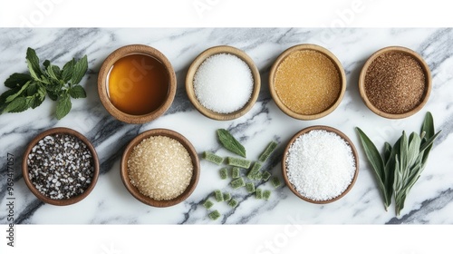 An assortment of sugar substitutes like stevia, agave syrup, and coconut sugar, arranged on a marble surface