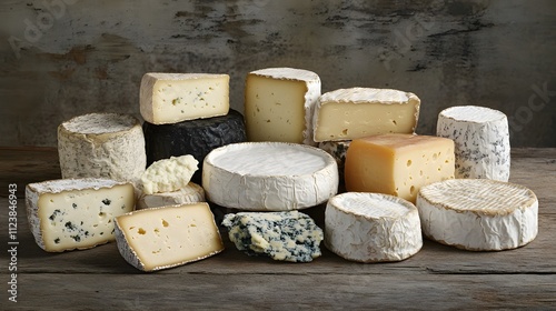 An Assortment Of Various Cheeses On Rustic Wooden Table