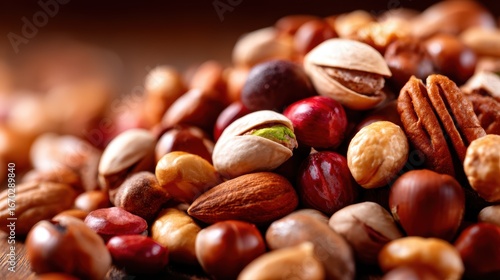 An assortment of various nuts displayed on a rustic wooden surface, showcasing a rich mix of textures and colors that highlight their natural beauty and nutritional value.