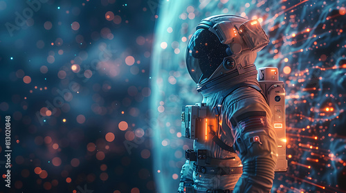 An astronaut clad in a modern space suit equipped with futuristic gear explores a shimmering cosmic environment