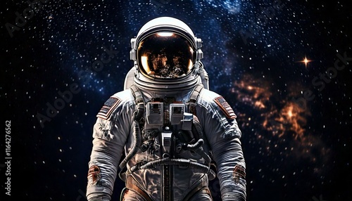 An astronaut in a spacesuit in which space is reflected. Universal darkness vantablack