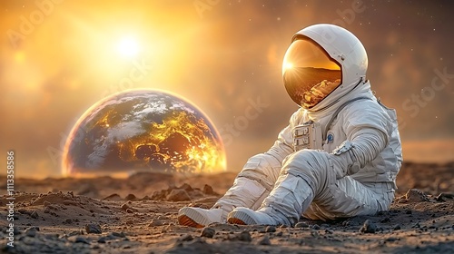 An astronaut in a white space suit is seated on the surface of the moon, gazing back at Earth in the distance