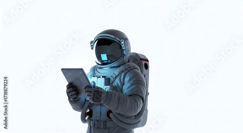 An astronaut in a white spacesuit holding a glowing tablet in a white background.