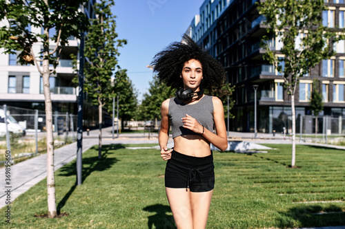 An athletic African-American young woman is jogging outdoors. A girl with an afro hairstyle in short sports bra and shorts runs on the street. Healthy lifestyle concept. Front view