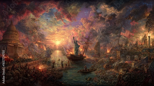 An awe-inspiring panorama of a city consumed by chaos and destruction, with the backdrop of a setting sun.