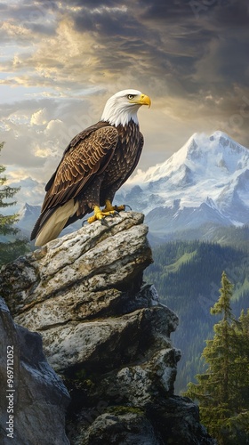 An eagle perched on a rocky ledge with a panoramic view of mountains in the background, exuding strength and vigilance