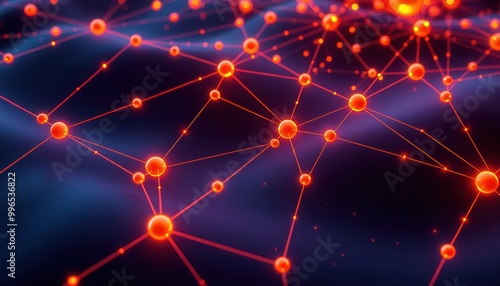An elaborate network of illuminated nodes and pathways on a dark blue background, illustrating the advanced technology and complex data communication networks that underpin today’s digital world.