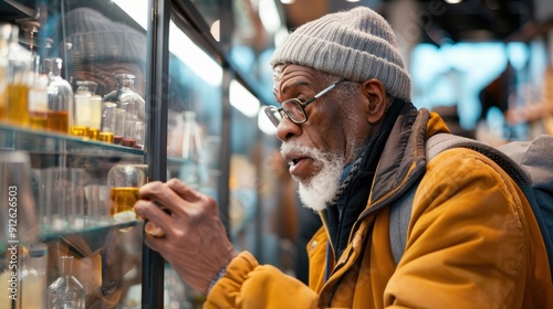 An elderly man explores an antique store, focused on vintage bottles displayed in glass cases