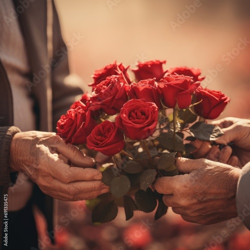 An elderly man gives a bouquet of red roses to an elderly lady. Love through the years. Valentine's Day. Close-up view