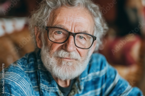 An elderly man with glasses and a beard smiles warmly indoors, exuding wisdom and comfort in a cozy environment.