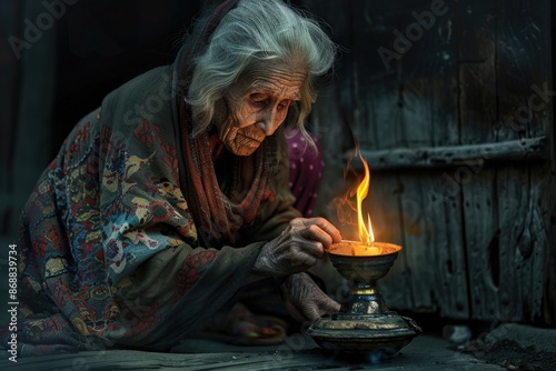 An elderly woman lights a candle on a plate, a simple yet intimate moment