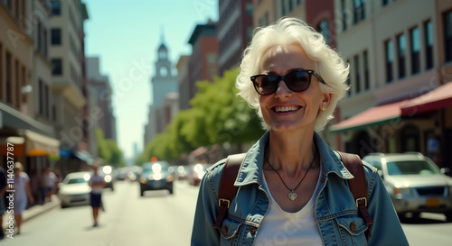 An elderly woman smiles and walks along a city street