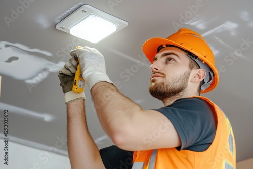 An electrician is installing spotlights on the ceiling. Handyman choosing between energy save and cheap incandescent lamp while changing light in the apartment