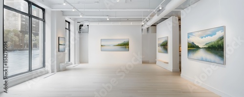 An elegant art gallery with white walls and natural light, featuring a curated selection of serene landscape paintings that add a touch of tranquility to the space.