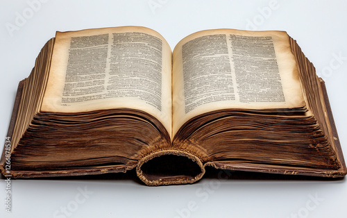 An elegant close-up emphasizing the texture of an open book against a white surface.