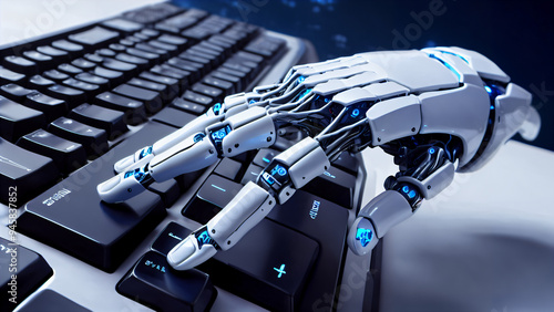 An elegant humanoid robot interacts with a keyboard in a high-tech environment that includes futuristic elements, illuminated panels and screens, displaying a sci-fi image of the future with an emphas