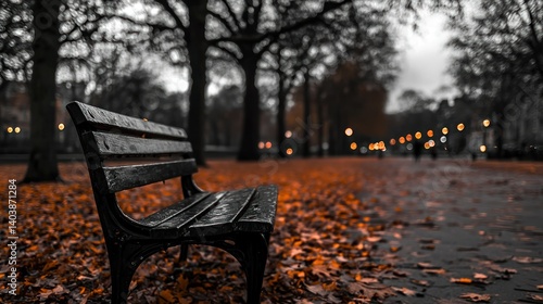 An empty bench sits in a park during the autumn season