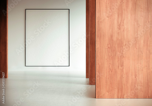 An empty black frame with blank empty space for your design on the white wall of a modern museum. single exposure of modern art. Perspective of wooden panels. Vertical mockup. 3D rendering