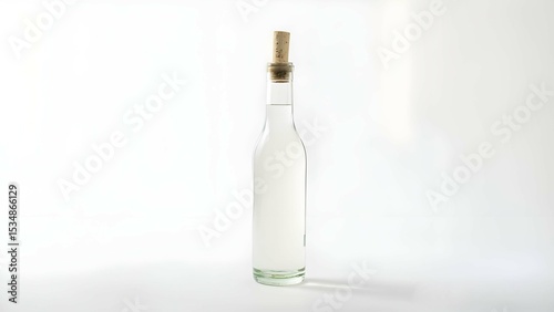 An Empty Clear Glass Bottle with a Cork Stopper on a White Surface